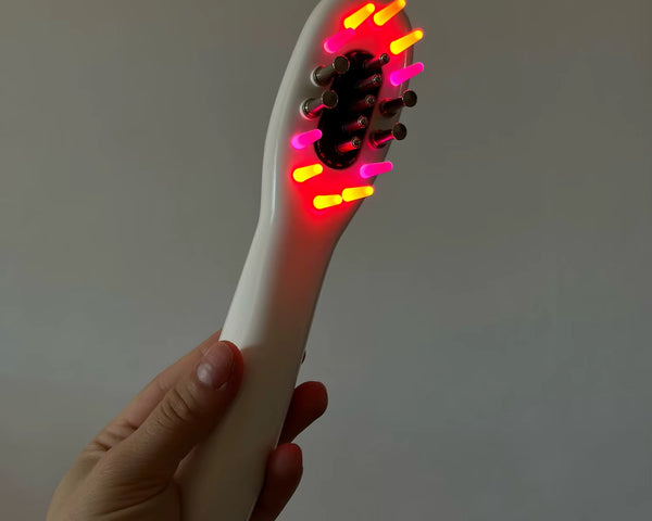 Les lumières bleue et infrarouge travaillent en profondeur : la lumière bleue assainit le cuir chevelu, tandis que l’infrarouge active la régénération cellulaire pour des cheveux plus denses et résistants.