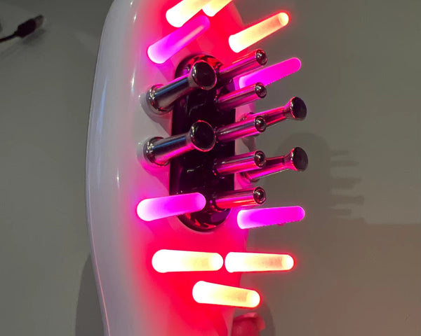 Les lumières bleue et infrarouge travaillent en profondeur : la lumière bleue assainit le cuir chevelu, tandis que l’infrarouge active la régénération cellulaire pour des cheveux plus denses et résistants.